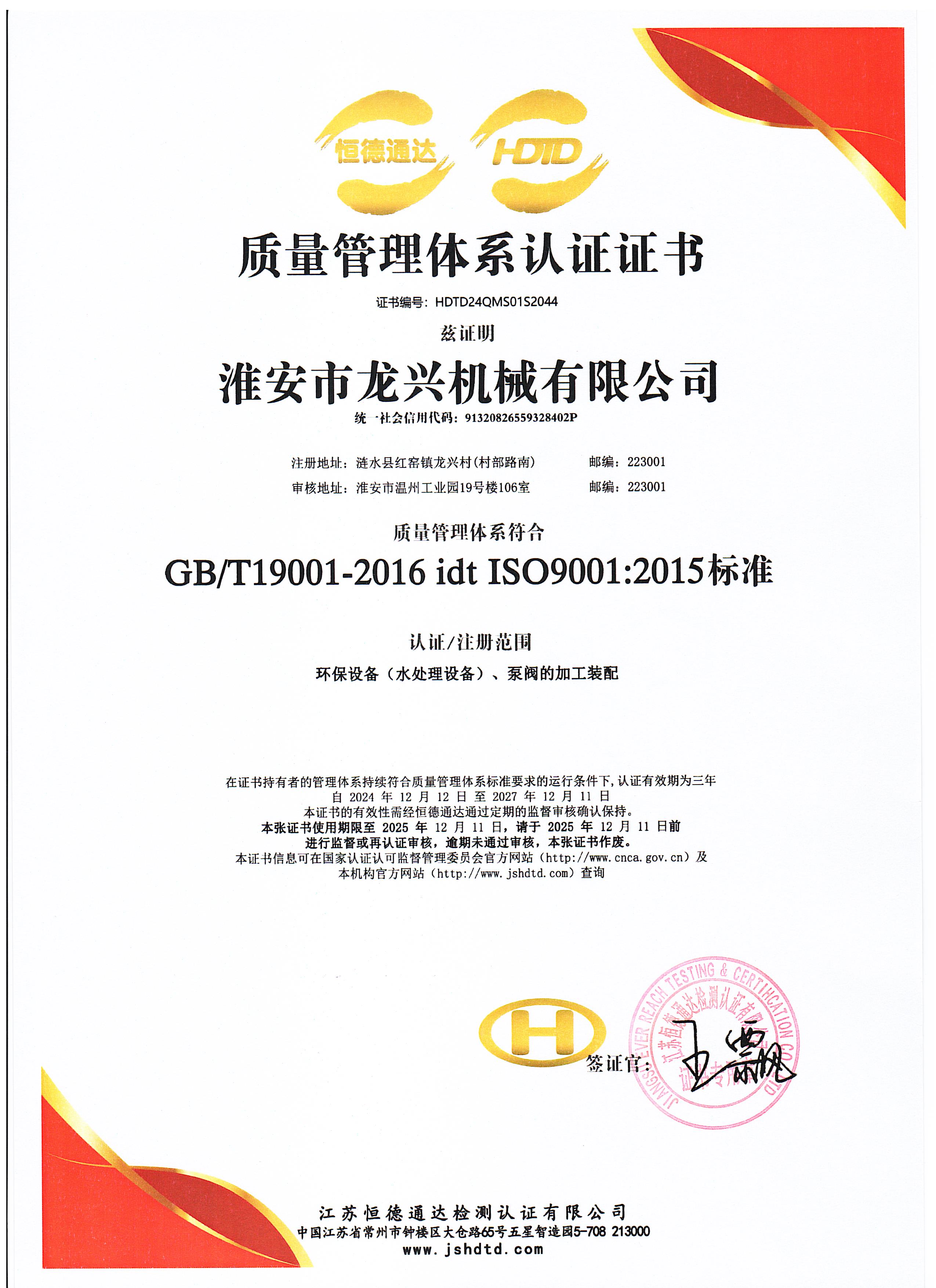 质量管理体系认证证书