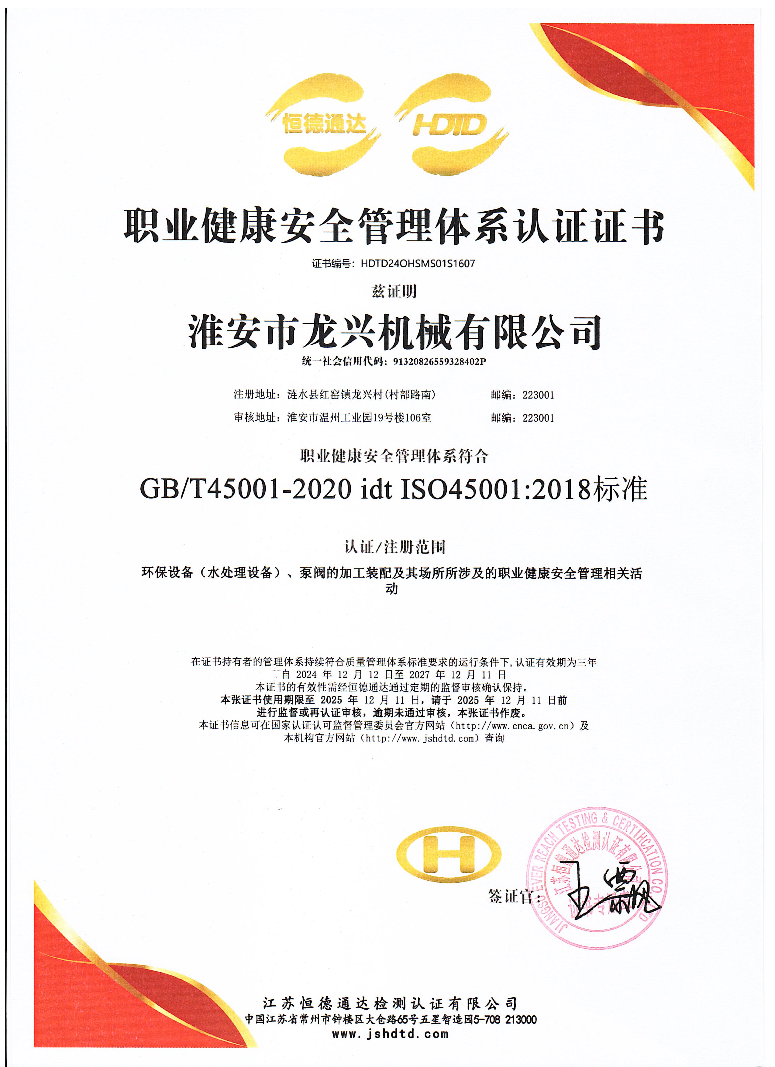职业健康安全管理体系认证证书